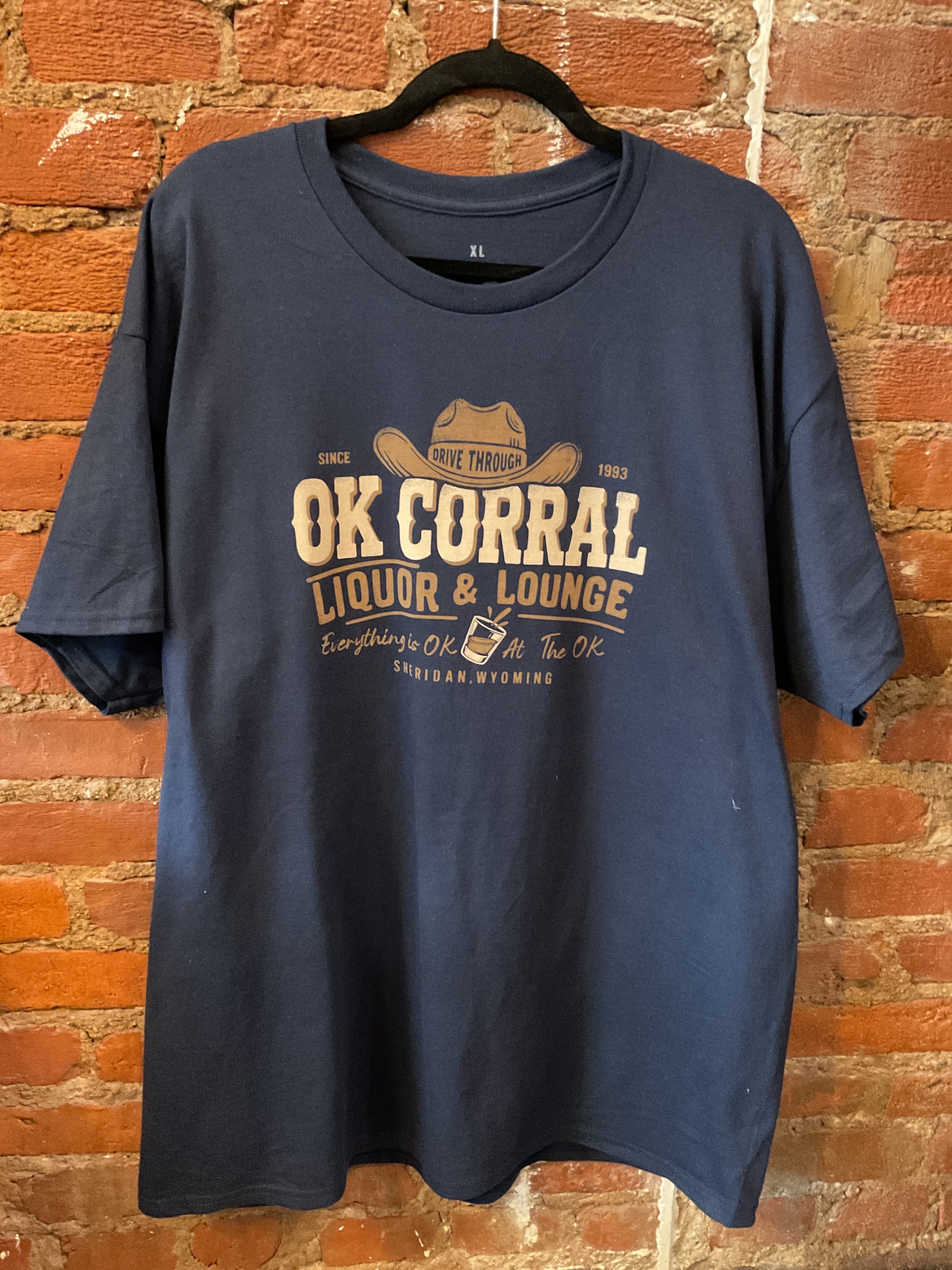 Step into the Wild West spirit with this navy short-sleeve tee featuring the legendary OK Corral Liquor and Lounge from Sheridan, Wyoming. It's the kind of shirt that tells a story and adds character to your casual wardrobe. Perfect for road trip enthusiasts, history buffs, or anyone who loves a touch of Americana flair. Comfortable enough for everyday wear, cool enough to make a statement. Size XL.