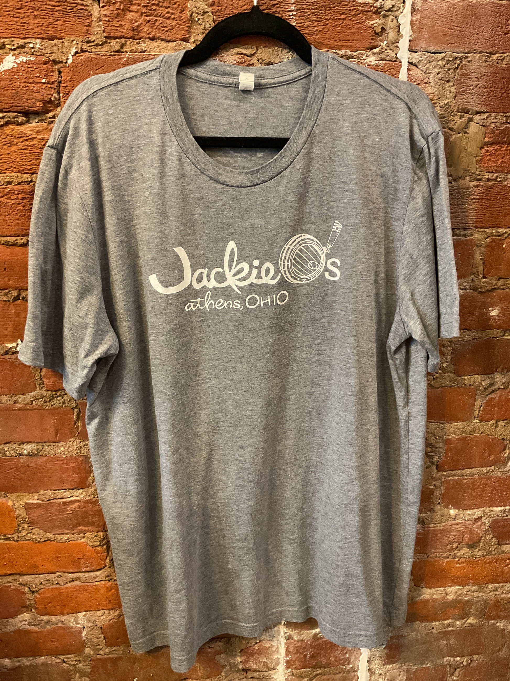 Bring a touch of iconic elegance to your casual wardrobe with this light heather grey tee featuring "Jackie O's" across the chest. Whether you're channeling old Hollywood glamour or just love a sophisticated reference, this shirt delivers understated style with a playful twist. Soft and versatile, it pairs effortlessly with your everyday essentials while adding that perfect dose of timeless cool. Size XL.