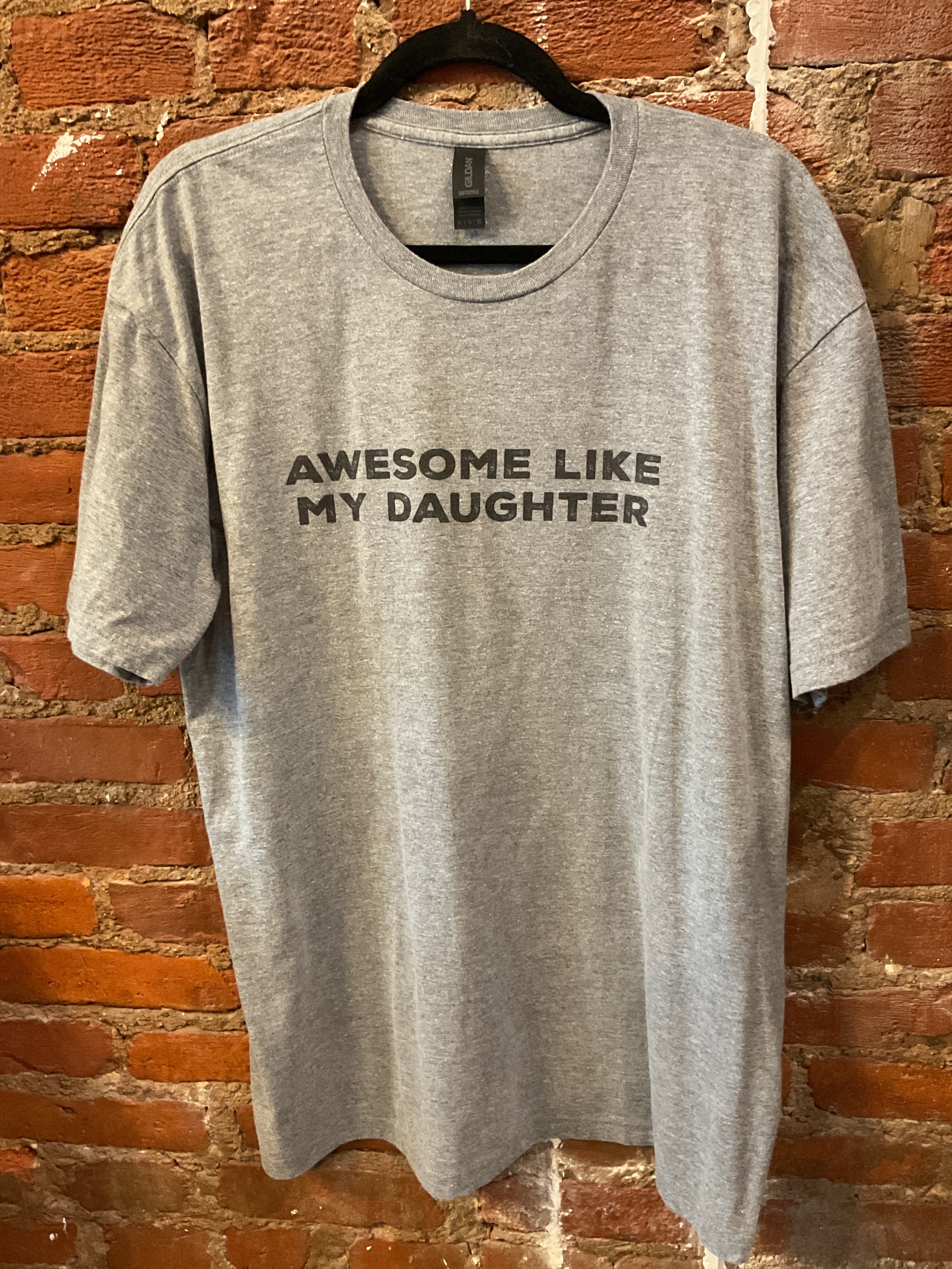 Celebrate the bond that matters most with this heather grey short-sleeve tee featuring "awesome like my daughter" in bold black letters across the chest. It's the perfect way to show your pride and spread some love—whether you're a parent, grandparent, or proud family member. Comfortable, heartfelt, and genuinely fun, this shirt says what needs to be said without being cheesy. Because sometimes the best style comes straight from the heart. Size XL.