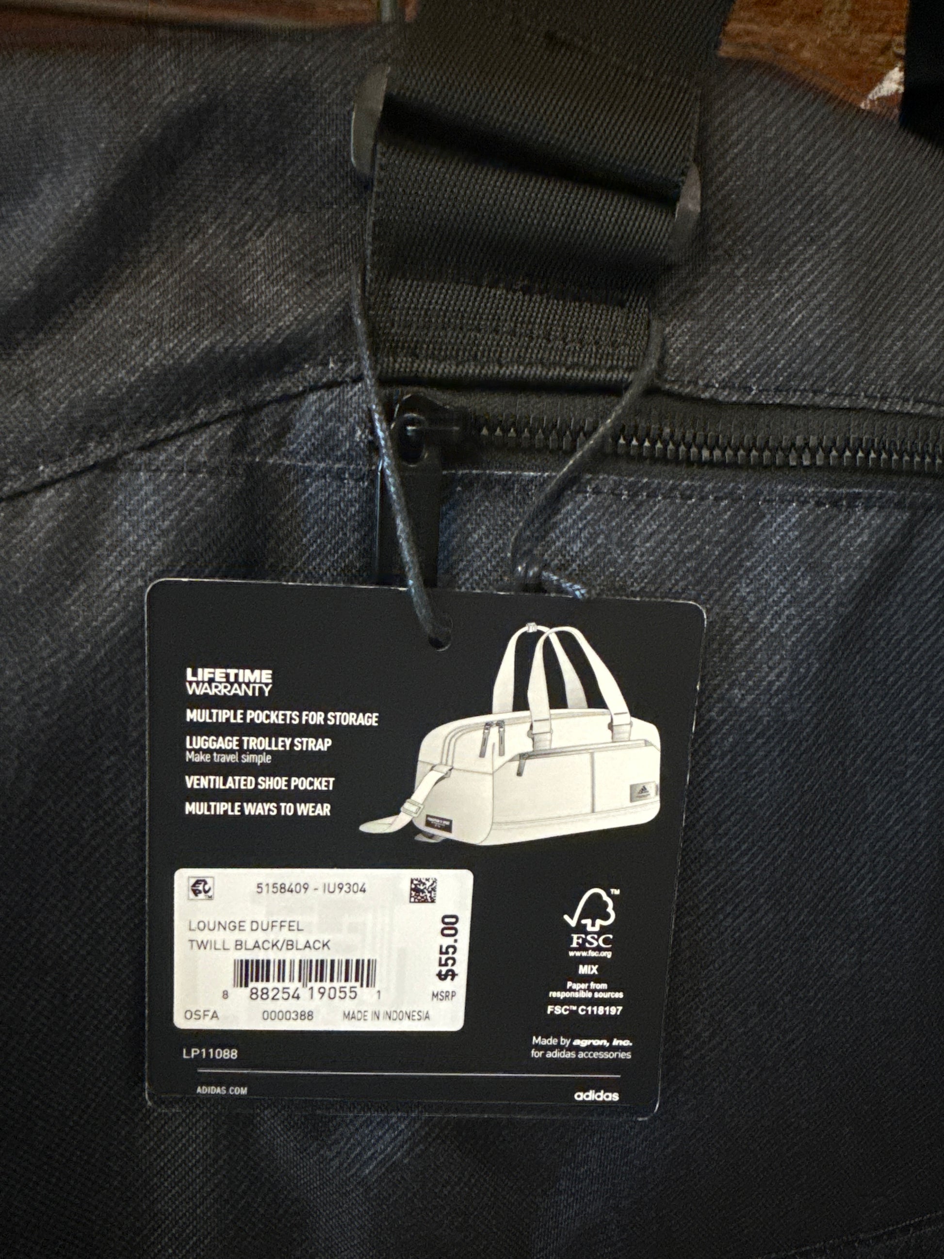 The ADIDAS NWT Duffle Bag arrives in pristine, new-with-tags condition, ready for immediate use. Featuring a sophisticated twill construction in black-on-black print, this bag delivers understated elegance with functional design. Originally retailed at $55, it offers exceptional value for those seeking reliable gear storage from a trusted athletic brand. The durable construction handles everything from gym sessions to weekend travel, while the minimalist aesthetic pairs seamlessly with any style. A practical investment in quality baggage.
