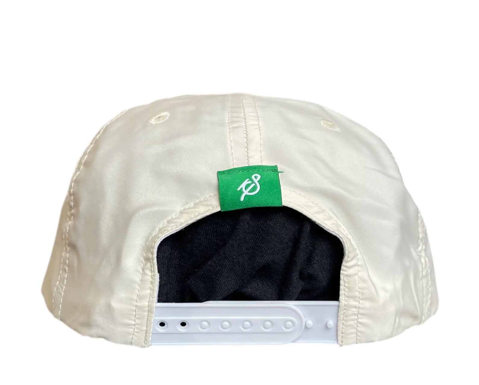 Join the Weekend Tequila Club with this off-white snapback hat! Crafted from lightweight nylon, it features a semi-structured mid-height crown and a classic five-panel design. Breathable eyelet ventilation keeps you cool, while the hybrid bill adds a unique edge. Finished with a fun pink rope accent and an adjustable snapback closure, this hat brings playful style to your weekend adventures.