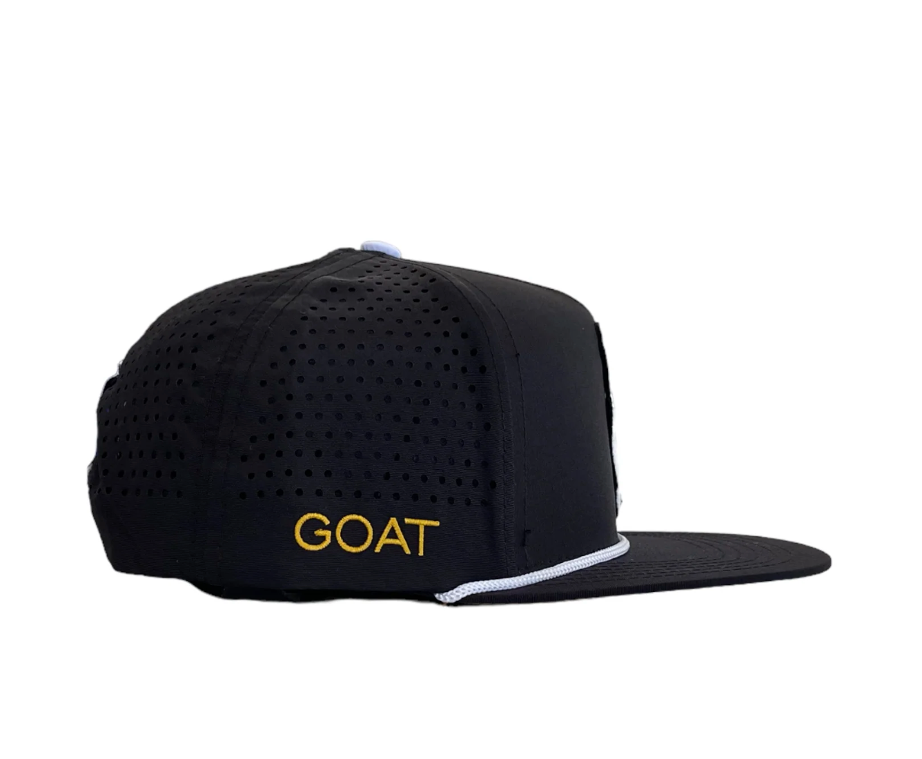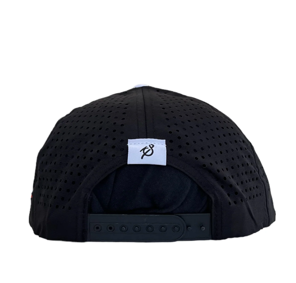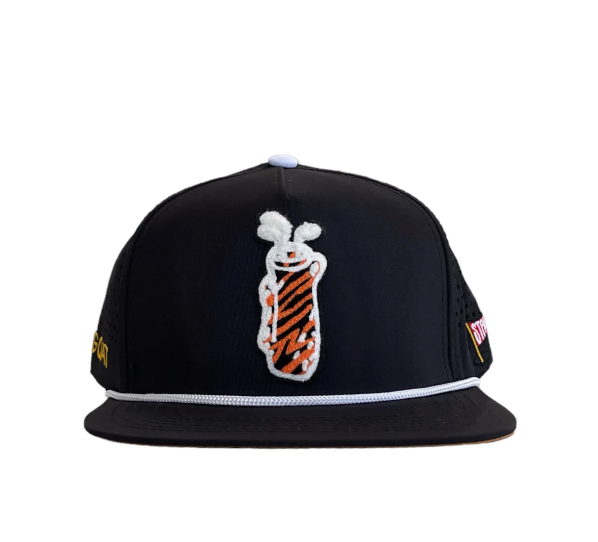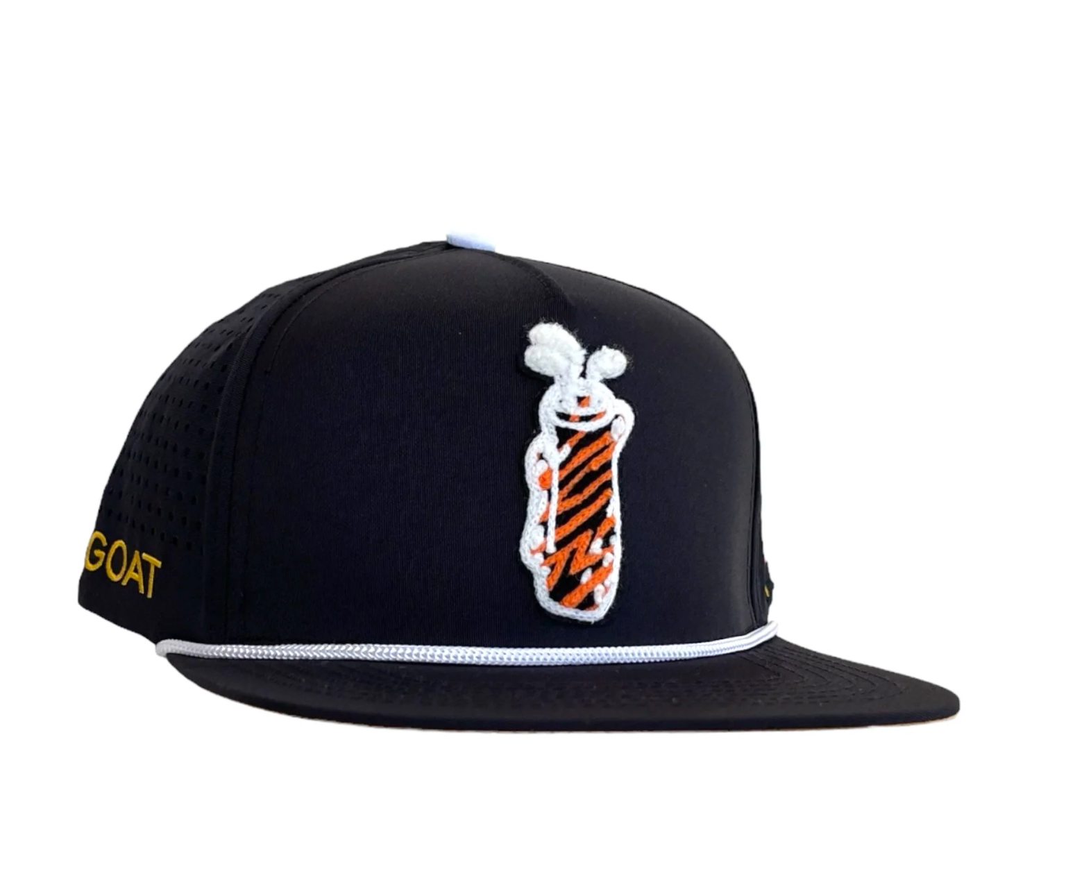 Hit the greens in style with the WOODS snapback! This black nylon hat features a structured mid-height crown and five panels for a classic fit. The golf-inspired tiger pattern adds a bold twist, while perforated ventilation holes keep you cool. A hybrid bill, white rope detail, and adjustable snapback closure complete this playful and sporty look.